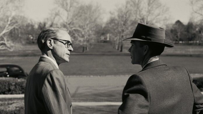 O drama histórico narra a vida de J. Robert Oppenheimer (Cillian Murphy), o físico teórico e diretor do Laboratório de Los Alamos, durante o Projeto Manhattan.